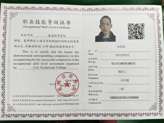 在人才競爭日益激烈的當下,國家對技能人才的重視程度不斷提升,各類技能補貼政策也相繼落地。近日,我司模具部五金模技工何保國就切實享受到了這一紅利——憑借剛?cè)〉玫哪>吖ぜ紟熥C書,成功申領(lǐng)到1萬元一次性技能補貼,成為公司技能提升的“先行者”和“受益者”。